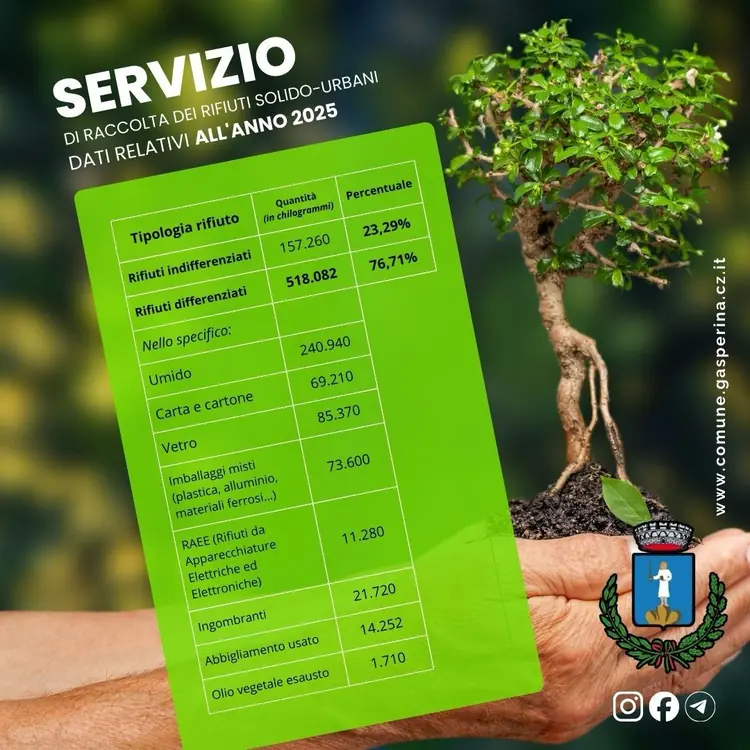 #ComuneGasperina #ambiente #menorifiuti 🟢RACCOLTA DIFFERENZIATA RIFIUTI ♻️I rifiuti differenziati nell'anno 2025 sono il 76,71% dei rifiuti totali prodotti. 📌 Facciamo la differenza: continuiamo a differenziare.